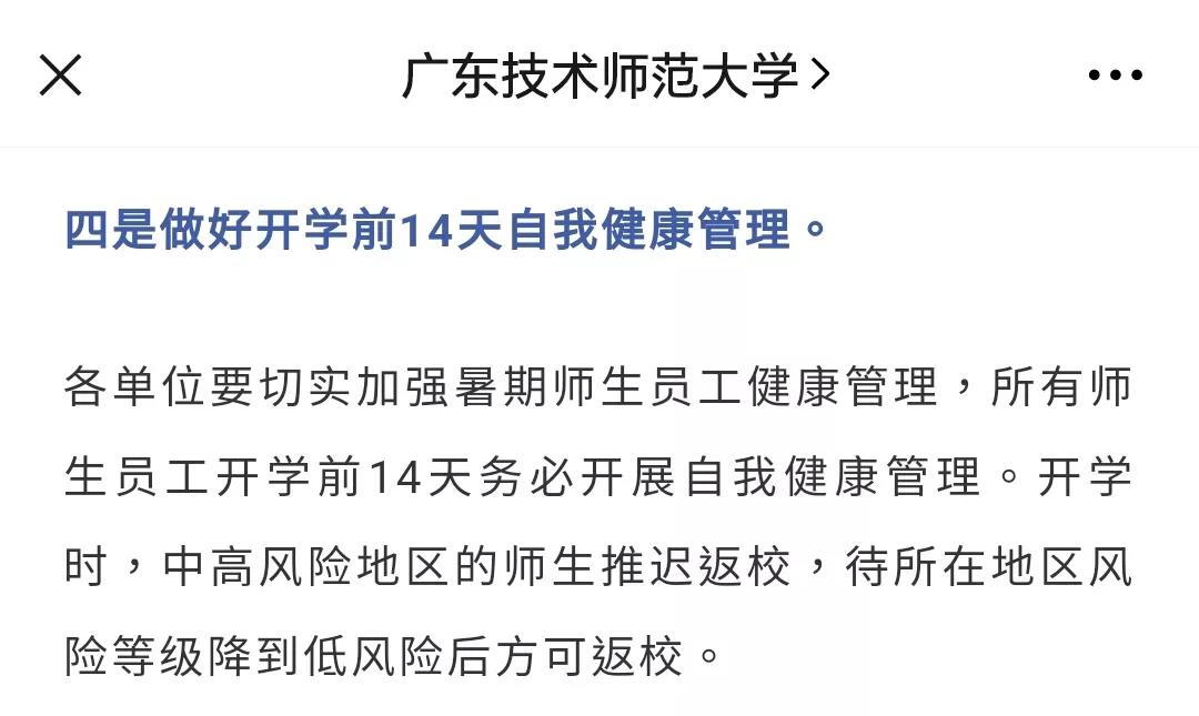 8月3日,广东技术师范大学发布通知,各单位要切实加强暑期师生员工健康管理,所有师生员工开学前14天务必开展自我健康管理。开学时,中高风险地区的师生推迟返校,待所在地区风险等级降到低风险后方可返校。