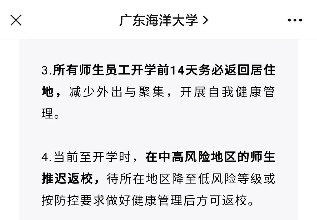 8月8日,广东海洋大学发布通知,所有师生员工开学前14天务必返回居住地,减少外出与聚集,开展自我健康管理。当前至开学时,在中高风险地区的师生推迟返校,待所在地区降至低风险等级或按防控要求做好健康管理后方可返校。