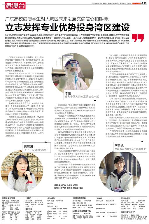 7月1日,庆祝中国共产党成立100周年大会在北京隆重举行,习近平总书记发表重要讲话,让广东高校学子深受鼓舞、倍感振奋。这其中,在广东高校求学的港澳生更是充满了民族自豪感。