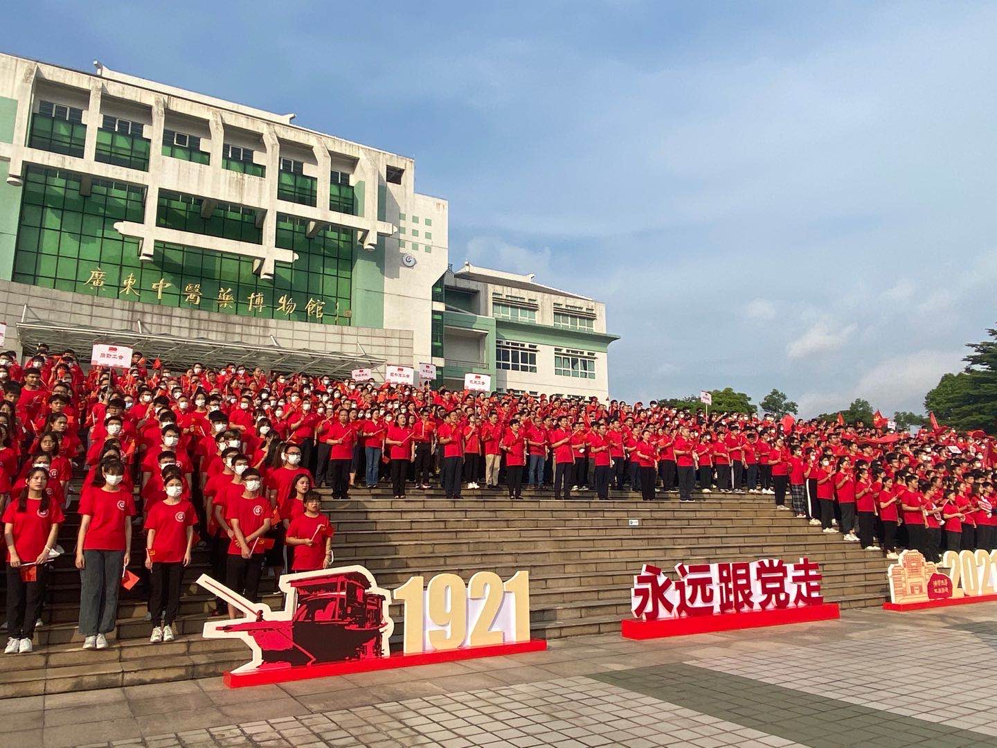 参加活动的师生手执党旗、国旗,身上贴着五星爱心贴纸,口罩上印着“永远跟党走”的图案,党员佩戴党徽,现场气氛在一片红色的海洋中更显热烈、喜庆而庄严。升旗仪式开始前,学校党委书记张建华、校长王伟等学校领导与师生一起大合唱,把歌声献给党,从《我们走在大路上》到《学习雷锋好榜样》,满怀激情的歌声响彻校园,洋溢着对党和国家浓浓的爱意。