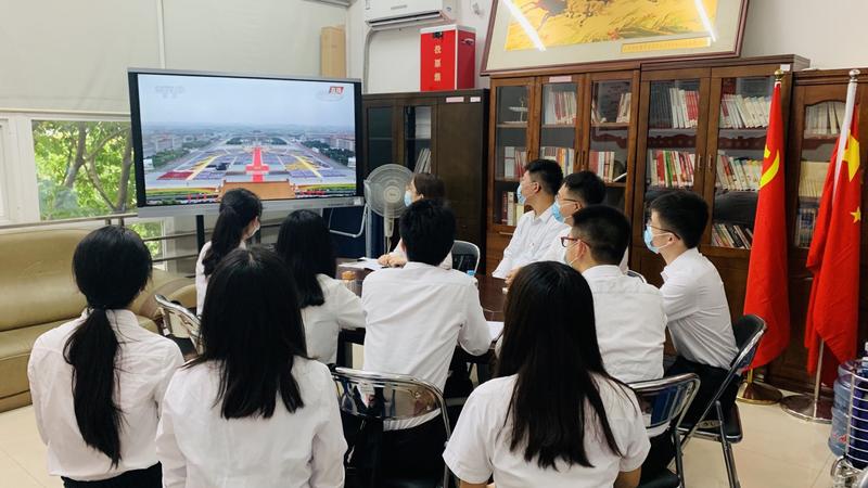 7月1日上午8时,庆祝中国共产党成立100周年大会在北京天安门广场隆重举行,广东各大高校组织师生以集中、分散相结合的方式收看收听庆祝大会现场直播。党员师生着正装、佩戴党徽,全程佩戴口罩收看。