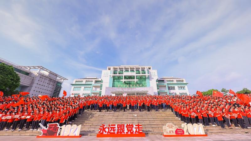 在她的带领下,在场师生再次把歌声献给党,《保卫黄河》、《团结就是力量》、《没有共产党就没有新中国》……一首又一首的经典歌曲饱含着百年的红色记忆,在歌声中,由广中医学生组成的方阵变换出“100”“1921”“2021”和党徽等图形,将现场气氛推至高潮。