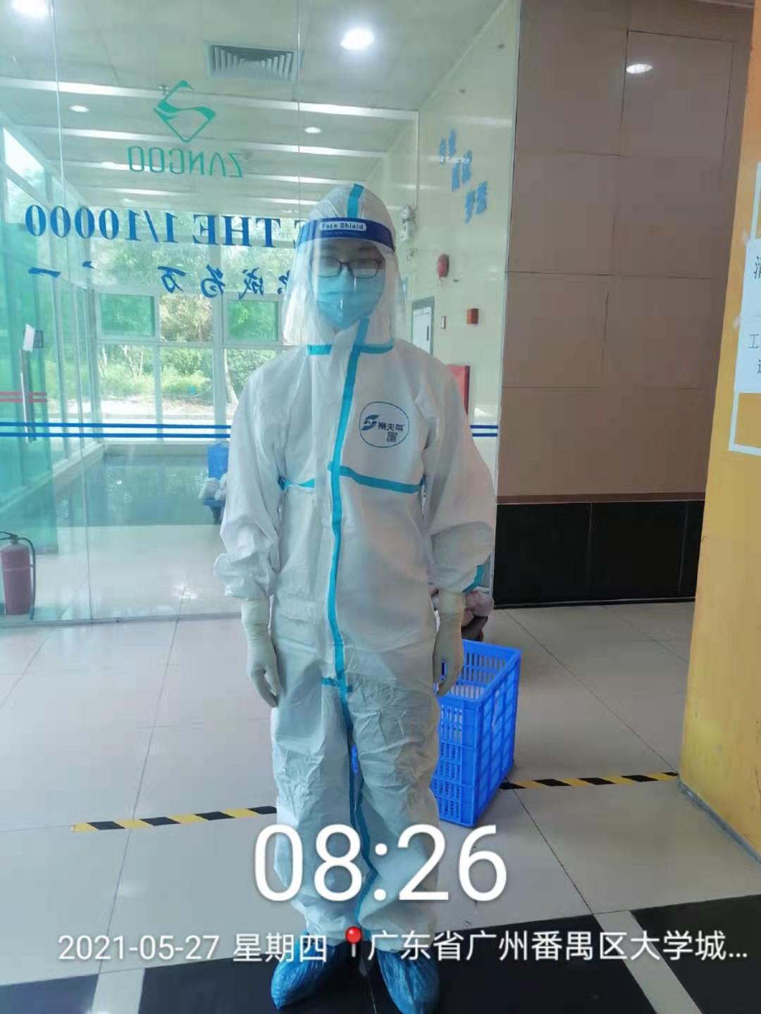 在隔离区期间,我负责130名隔离师生的用餐保障。每天搜集整理用餐信息,穿上防护服和同事一起推着小推车给孩子们送餐。六层楼逐一房间发放餐食,一天三次,衣服湿了又干,干了又湿,但我感觉是累并欣慰着!