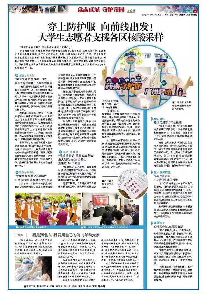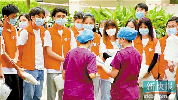 在赵海玉他们出征的头一天,南方医科大学连夜组建了一支由近1500名学生志愿者和45名辅导员组成的学生抗疫服务队,以准备随时支援白云区核酸检测工作。6月5日,在学校的调度下,220名志愿者们分别前往南方医科大学、人和镇、景泰街道、白云湖街道及京溪街道5个服务地点,开展核酸检测志愿服务。