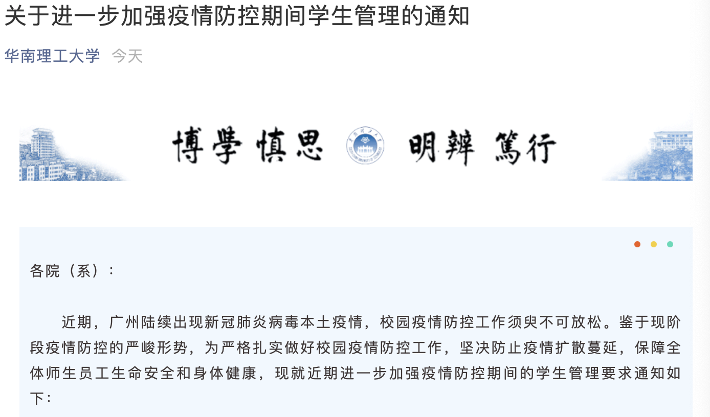 其中,华南理工大学要求暂停学生各类外出实习活动,暨南大学学生“非必要不出校”,非紧急或重要公务的校外人员,一律不得入校。华南农业大学学生出校须经辅导员审批,暂停校园非必要大型聚集活动,beat365英国官网网站预约进校人员,则需持3天内核酸检测阴性证明。