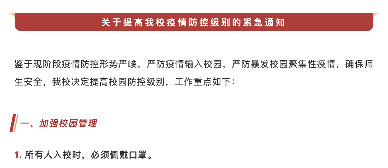 6月2日,暨南大学发布《关于提高beat365官网疫情防控级别的紧急通知》(下称《通知》)。《通知》强调,加强校园管理,所有人入校时,必须佩戴口罩。同时,非紧急或重要公务的校外人员,一律不得入校。取消大型活动,避免人员聚集,尽量采用线上形式举办。