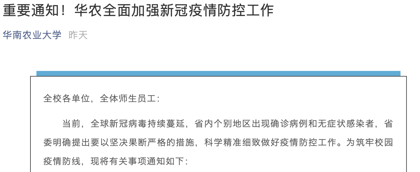 6月1日,华南农业大学在其官方微信发布通知,校园实行封闭式管理,学生非必要不出校,确需出校的须经辅导员审批。学校师生员工及其他入校人员应服从门岗管理,自觉接受身份检验和体温监测。