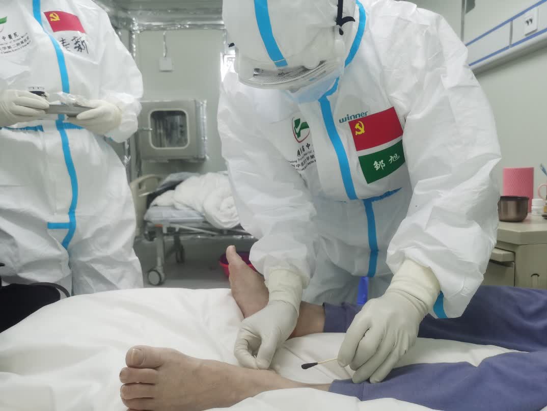 国家第四批援助湖北中医医疗队广东团队领队、广东省中医院重症医学科主任邹旭教授为患者进行针灸治疗。广东省中医院供图