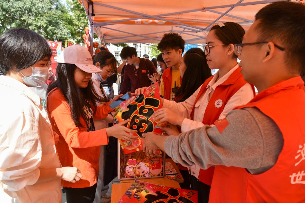 “我早早就知道这个活动啦,”现场一位同学对记者说,“没想到在学校过年也这么好玩!马上发朋友圈!”她抱着刚抽到的一大包零食和广中医定制台历,在年味布景前不停地拍照。
