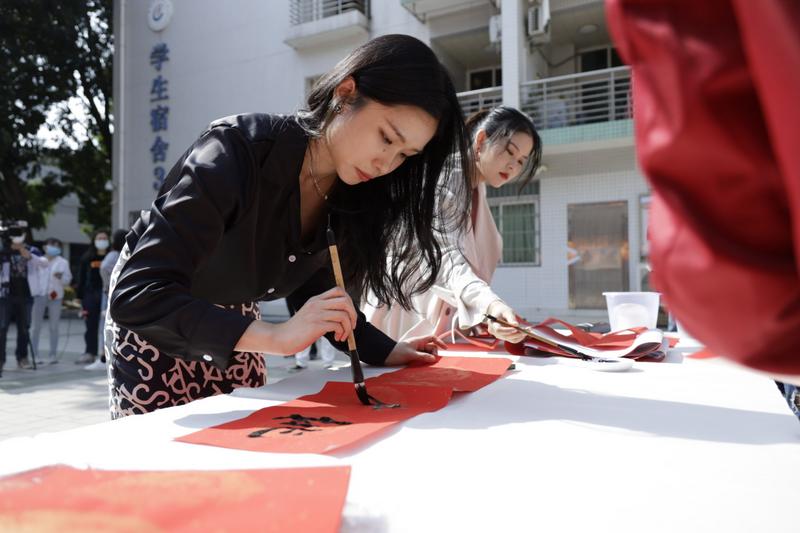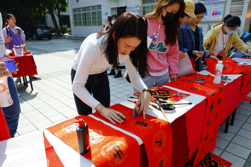 2月3日,立春,是传统节气中春天的开始,也是beat365英国官网网站“杏林团圆年”系列活动的第一天。上午11点,学校生活区装扮一新,在一个可爱的大型年味布景前面,同学们正在举办“杏林年味铺”活动,写春联、领福字、抽大奖……现场一片欢乐,俨然已经是过年的气氛。