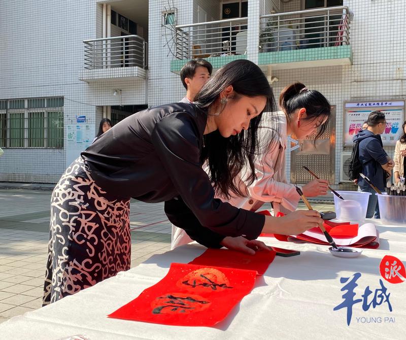 “杏林年味铺”的活动现场搭建了喜气洋洋的专属年景,同学们正在写春联、领福字、抽大奖……现场一片欢乐,俨然已经是过年的节奏。
