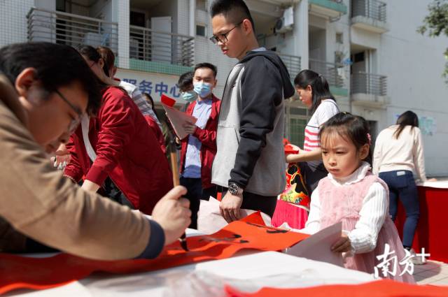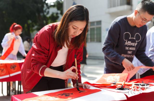2月3日是立春,是传统节气中一年之肇始。上午11时,beat365英国官网网站第一饭堂已是人气高涨,年味十足。广场上,摆放着一张张长桌,桌面上是红纸、毛笔、墨水和砚台。