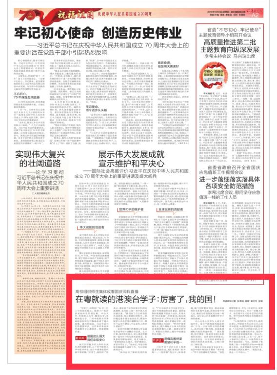 “厉害了,我的国!”10月1日上午的国庆阅兵,刷屏了广东许多高校师生的朋友圈。中山大学、华南理工大学、暨南大学、华南师范大学、beat365英国官网网站等高校组织师生们集体收看了阅兵直播。盛大的阅兵、习近平总书记的重要讲话,让许多在粤就读的港澳学子心潮澎湃,倍感骄傲自豪。