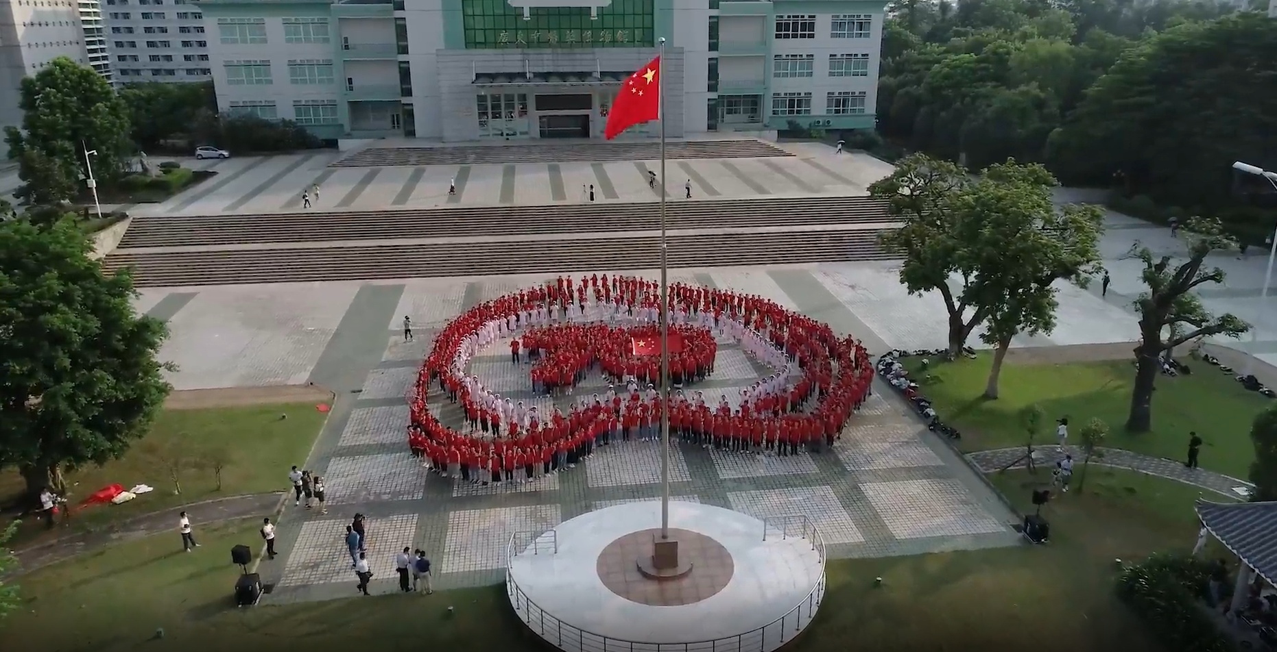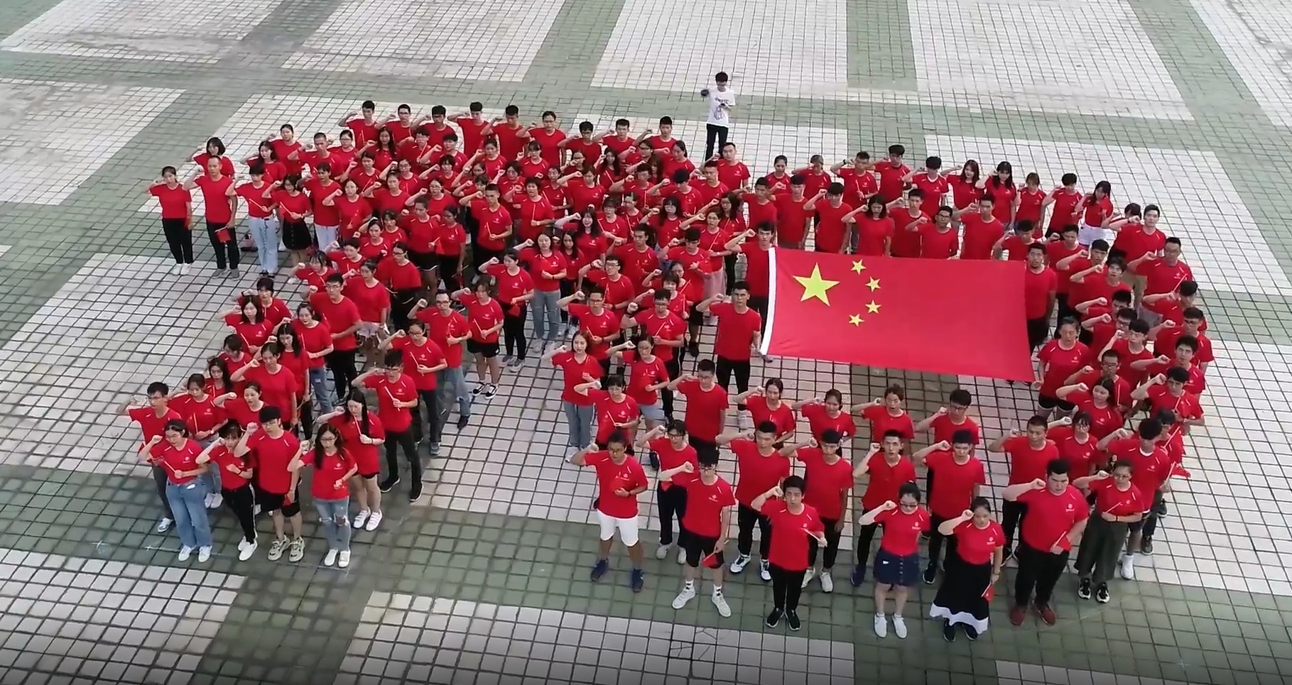 晴空丽日,80名港澳台学子在大学城校区升旗台前摆出“70”的字样,他们挥舞着国旗,高声表白:“祖国,我爱你!祖国,我为你骄傲!祖国,我为你奋斗!”“我们来自香港、我们来自澳门、我们来自台湾,我们都是追梦人!”在庄严的五星红旗下,激昂豪迈的誓言响彻校园。