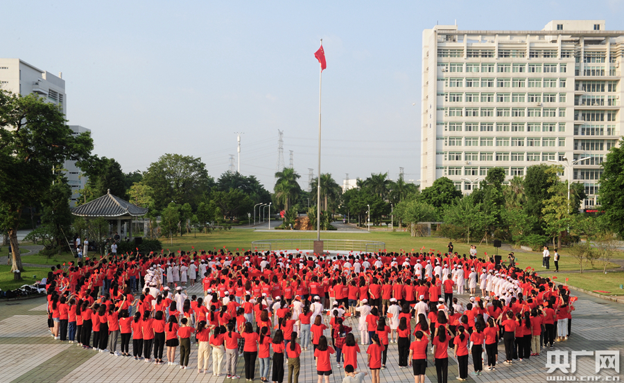 学校国旗广场上,来自于港澳台和内地的千余名医学生身着红色衣服,围绕成“心”型向祖国表白,港澳台学生排列成“70”作为队形,致敬中华人民共和国成立70周年。