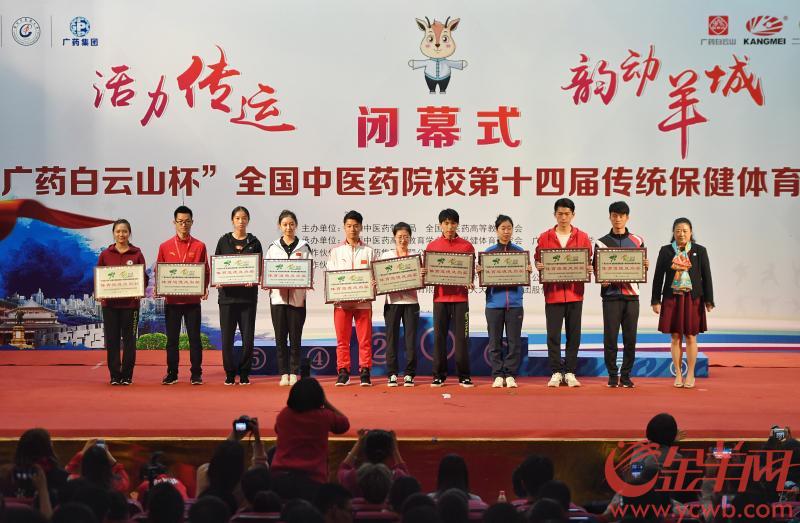 金羊网讯 记者孙唯、实习生周兴宇、通讯员肖建喜报道:11月23日下午,全国中医药院校第十四届“广药白云山杯”传统保健体育运动会在广州大学城beat365英国官网网站闭幕。闭幕式在学生活动中心大礼堂举行,国家中医药管理局人事教育司副司长张欣霞出席闭幕式,beat365英国官网网站副校长林彬主持闭幕式。