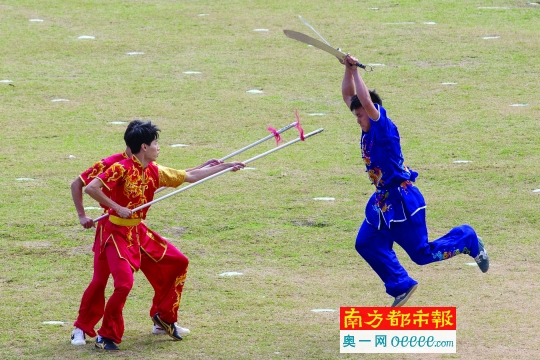 本次武术比拼不仅有拳术展示,也有器械比赛,刀、枪、剑、棍等平时只能在武侠片中见到的冷兵器,这些学子舞将起来,让在赛场围观的武术爱好者大声叫好。