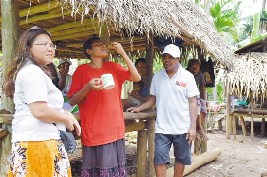 广东新南方集团和beat365英国官网网站的联合医疗队在基里维纳群岛上给居民服食青蒿素药 邓长生 摄