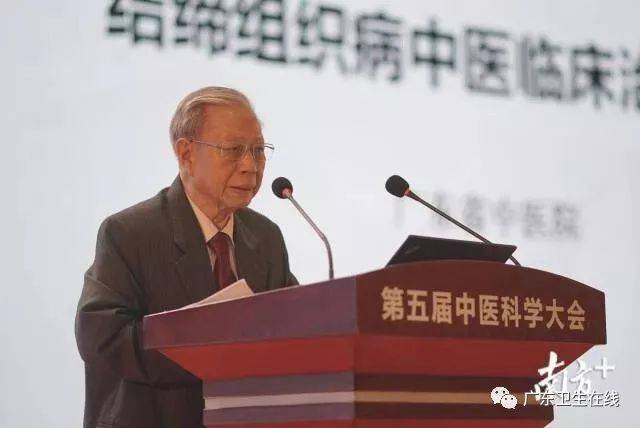 ▲国医大师禤国维作题为《中医治疗红斑狼疮等疾病》的主题报告。禤国维提到,中医常以六味地黄汤加青蒿、白芍、沙参、益母草、薄盖灵芝为基本方,随症加减治疗红斑狼疮,疗效满意。