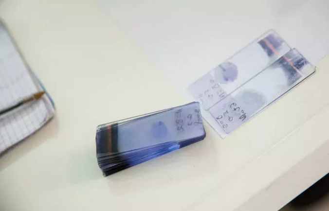 ▲2018年4月17日在科摩罗大科摩罗岛拍摄的当地居民血液样本玻片。新华社记者 吕帅 摄