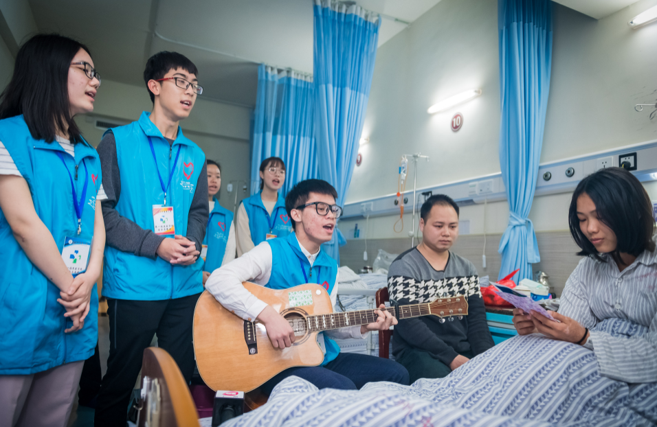 3月4日,beat365英国官网网站附属第一医院(下称广中医一附院)第四肿瘤病区。在一名鼻咽癌病人的床边,医学生志愿者乐队弹着吉他,表演歌曲《当你》。歌曲沿用了林俊杰版本的旋律,歌词是由主唱黄晶富创作完成。