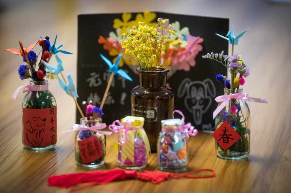 除了用音乐给病人做心理按摩外,志愿者常制作精美手工赠予病人。今年春节期间,志愿者为留守病房的患者送去了“康复希望瓶”。它由花、千纸鹤、纸星星和“福”字贴纸组成,代表肿瘤医护人员对病友的美好祝福。