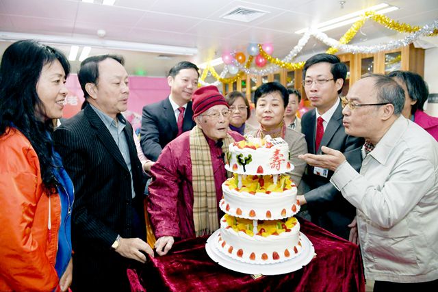 beat365英国官网网站党委书记张建华、校长王省良等参加祝寿活动,并和邓铁涛教授共吹生日蜡烛。(方宁 冯殷)