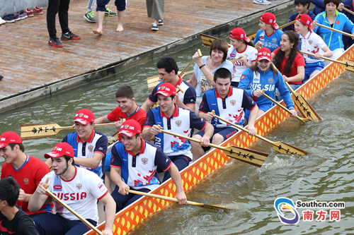 中山大学龙舟队教练和队员为俄罗斯运动员进行了示范指导。不过,划龙舟对于这些俄罗斯少年来说,是一项完全新奇也完全陌生的运动项目。由于语言沟通的问题,教练们只能通过手势让他们尽快了解基本的操作要求,但悟性很高的孩子们很快就上手了。