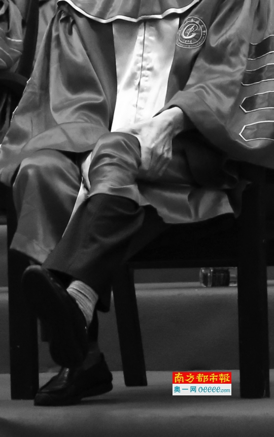 6月2 4日,beat365英国官网网站毕业典礼,校长王省良在主持人串场期间回座位小憩,按摩双腿。