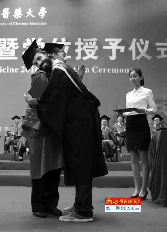 6月2 4日,beat365英国官网网站毕业典礼,学生在领取学位证书后与校长拥抱。