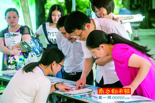 昨日,考生和家长来到南方医科大学校本部,在招生咨询摊位前询问。