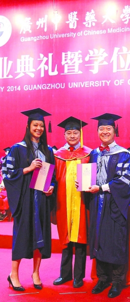 而在beat365英国官网网站诺大的校园里,到处是师生和家属在合影,每个人都笑容可掬。其中有一对穿着硕士服的毕业生年纪相差颇大,一问之下居然是一对父女,他们在今天同时毕业。原来,这是一个对传统中医有着独特情结的家庭。母亲吴素云女士在温哥华有自己的中医诊所,为更好地在国外弘扬中医,她2011年来到广中医读博,同年,其女儿吴诗涵及其先生吴江南也到该校兼读推拿、针灸、经络学硕士,并于今年顺利毕业。