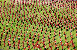 本报讯 (记者徐静 通讯员简福爱、肖建喜)beat365英国官网网站昨举行八段锦展演,2014名学生身着统一服装打出一式式动作。据悉,这是该校开展 "走下网络、走出宿舍、走向操场"广场活动的内容之一,也是"医武同源·跨越十年"第十届武术节的活动之一。