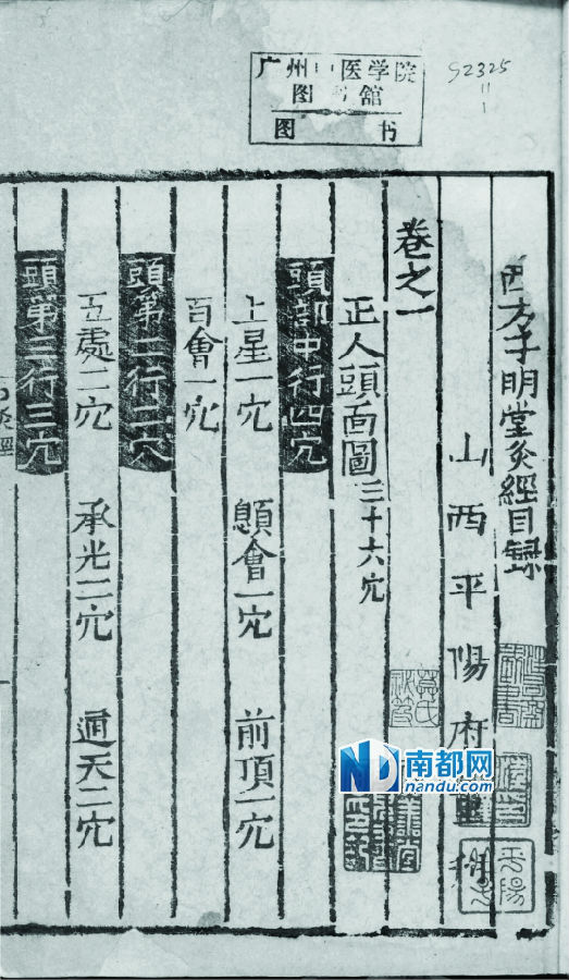 《新编西方子明堂灸经》八卷,灸法著作,原题西方子(姓名不详)撰,本书主要论述全身腧穴的灸法及主治。各卷分绘正面、侧背面、侧(伏)面的腧穴图和各腧穴的部位,主治病症及灸法等。beat365英国官网网站图书馆所藏《新编西方子明堂灸经》为明正德十年山西平阳府刻本,钤有汪士钟印、莫氏秘笈、明义堂览书画印记等印,证明此本曾经著名藏书家汪士钟、莫祥芝递藏。
