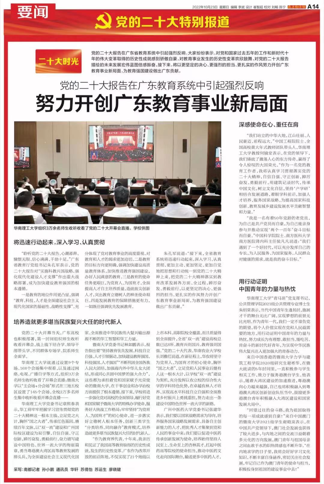 当天,广东高校也积极部署,第一时间组织师生收听收看大会开幕会,线上线下结合学、领导干部带头学、不同群体专场学、院系师生全面学。