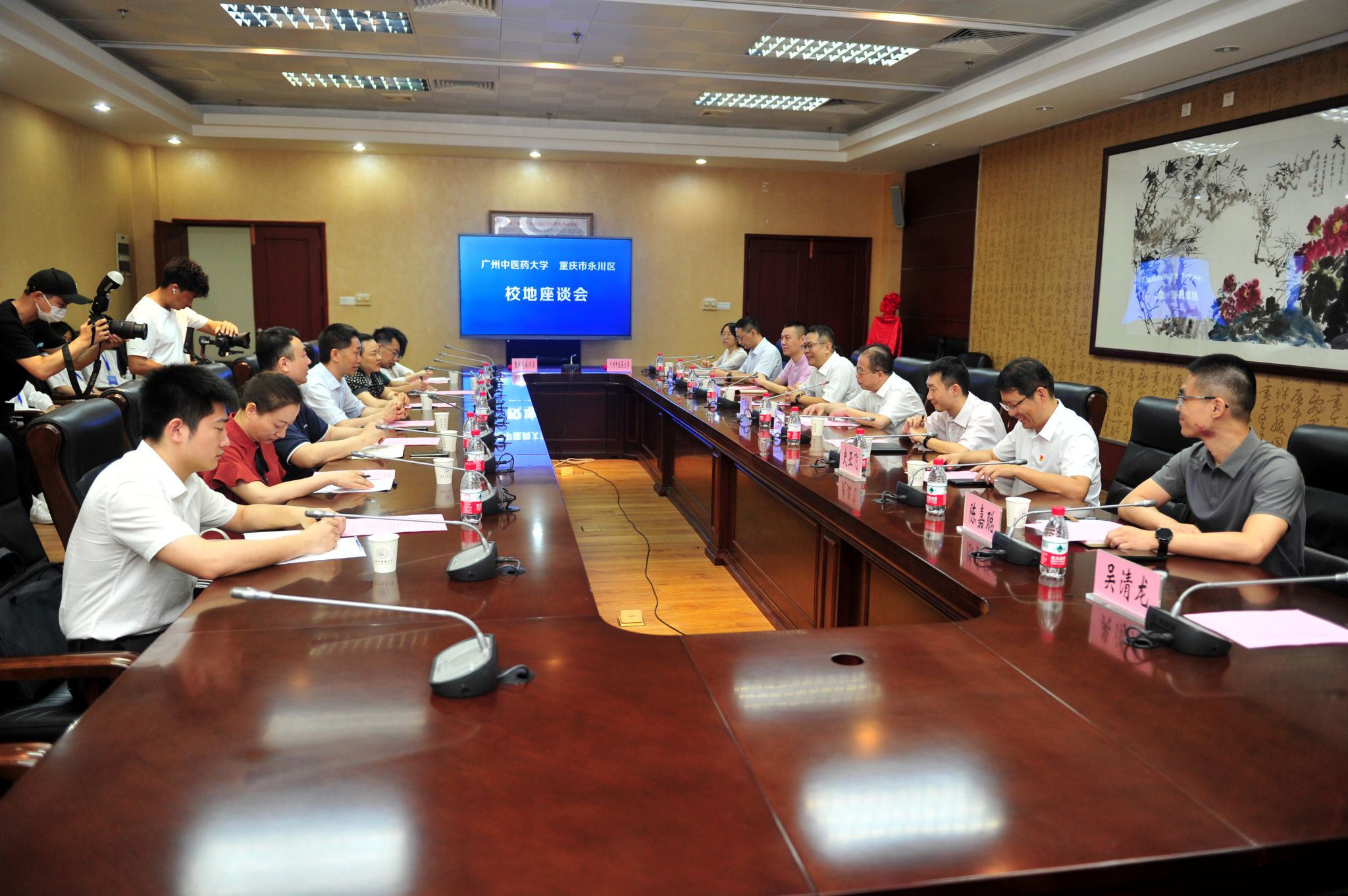 刘中秋代表学校对李世红副区长一行来访表示热烈欢迎,并向来宾介绍学校发展历程、总体情况和近年来在学科建设、人才培养、师资队伍、医疗服务、援外交流、科研发展等方面的成效。李世红介绍了重庆市永川区的建设发展情况和2023年“百万英才兴重庆”暨永川区“逐浪奔永”全国重点高校引才活动的开展情况,并就加强校地合作提出展望,希望校地携手、共同开创“广中医—永川区”合作共赢新局面。