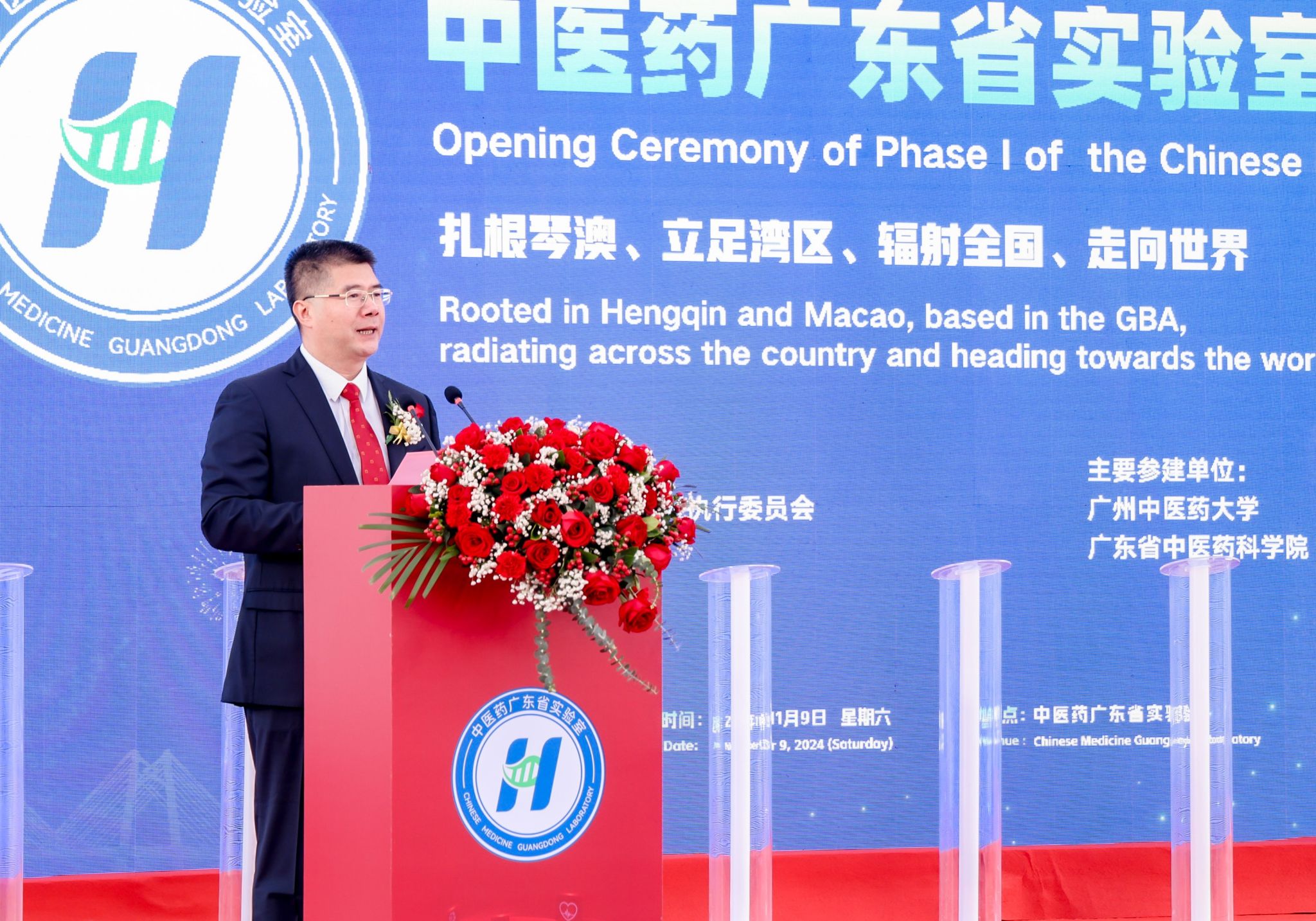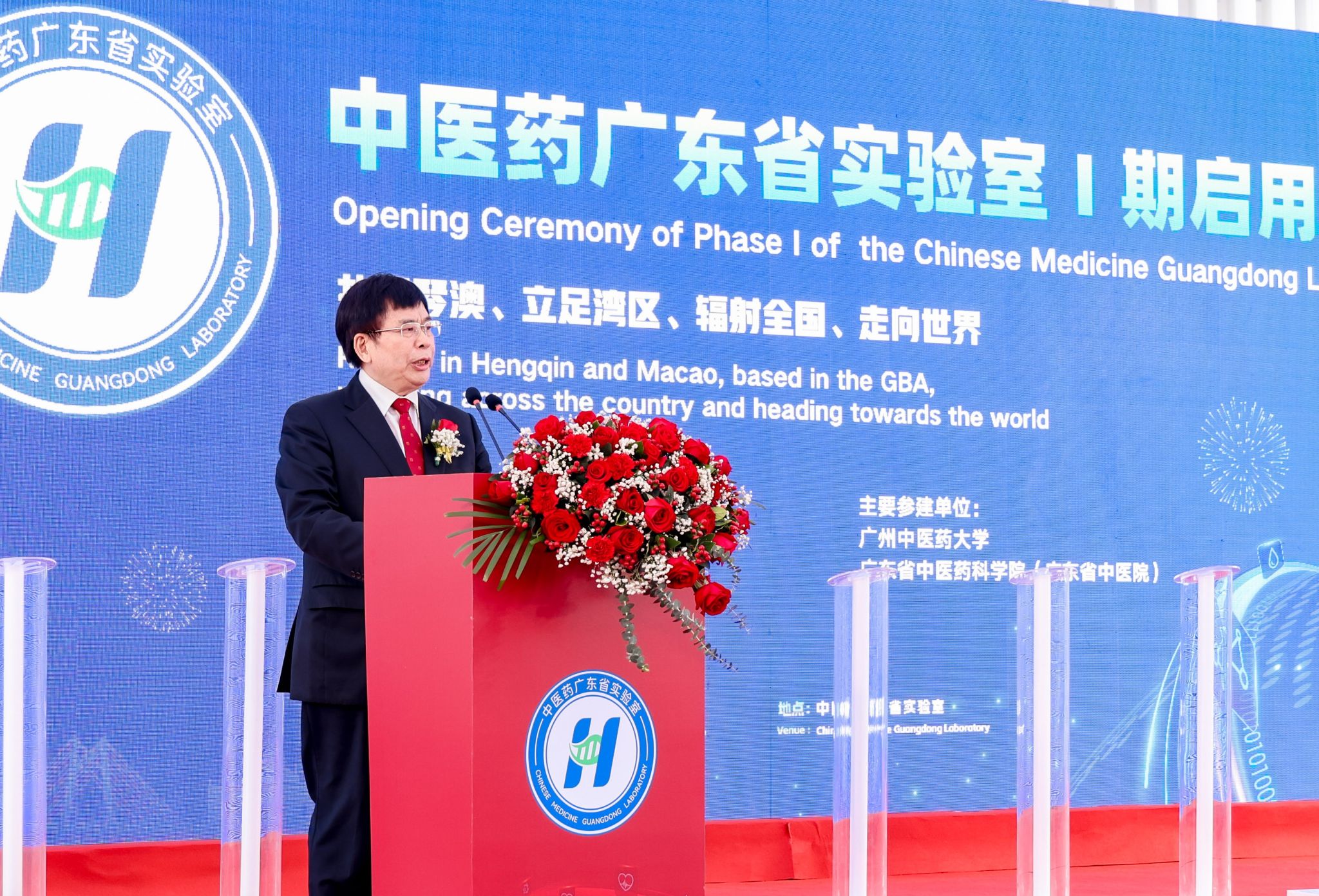 11月9日,中医药广东省实验室(简称“横琴实验室”)Ⅰ期启用仪式在广东横琴粤澳深度合作区顺利举行。国家卫生健康委党组成员、国家中医药管理局党组书记、局长余艳红,广东省委常委张国智,澳门特区政府经济财政司司长、横琴粤澳深度合作区执委会主任李伟农,中国工程院院士、横琴实验室主任、中医证候全国重点实验室主任刘良,中国太平保险集团董事长王思东,中央人民政府驻澳门特区联络办公室经济部部长刘德成,珠海市委副书记、市长黄志豪,广东省政府横琴办主任、横琴粤澳深度合作区执委会副主任聂新平,广东省人民政府副秘书长郭亦乐,广东省卫生健康委党组书记刘利群,广东省科技厅副厅长吴世文,横琴粤澳深度合作区执委会副主任符永革、苏崑,第十三届全国政协常委、澳门科技大学校监廖泽云,beat365英国官网网站党委书记陈文锋,澳门特别行政区经济财政司办公室主任辜美玲,国家中医药管理局国际合作司司长吴振斗,广东省中医药局副局长柯忠,广东省中医药科学院(广东省中医院)党委书记史俏蓉,以及来自高校、医院、企业、科研合作团队等相关单位负责人参加仪式。仪式由横琴实验室副主任周华主持。