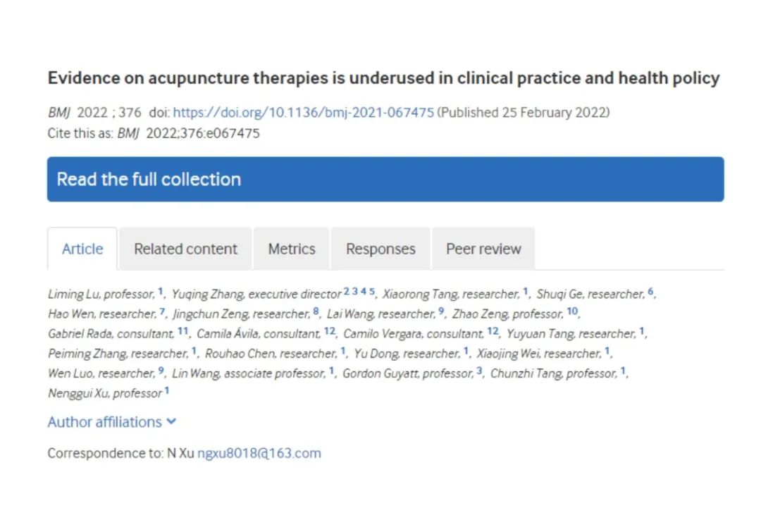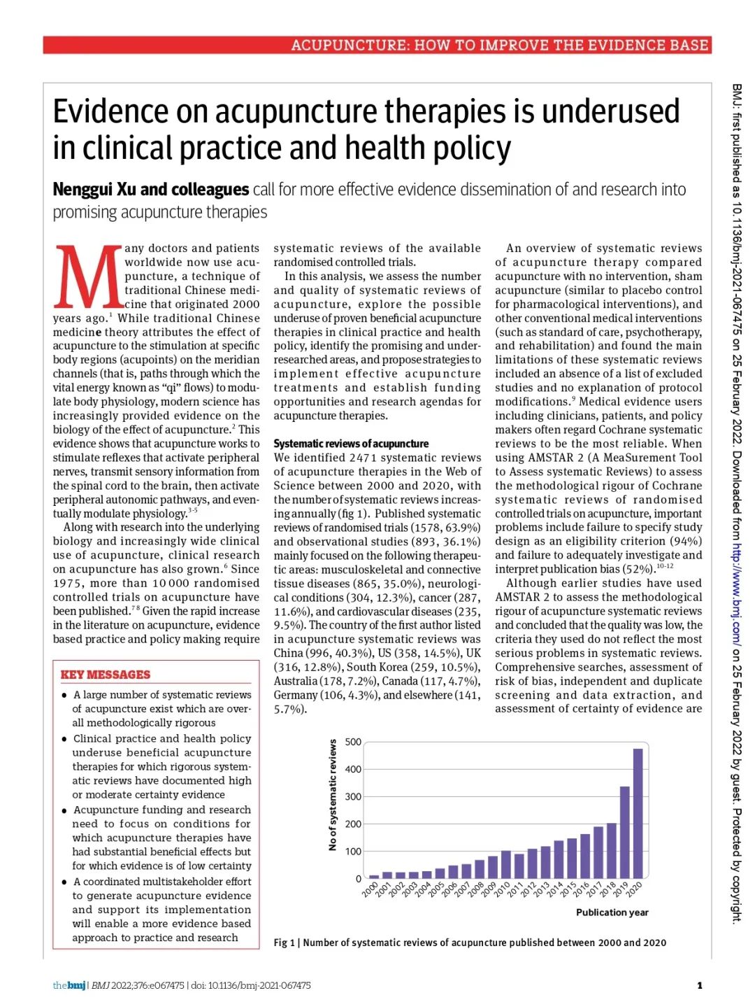 2月25日,beat365官网许能贵教授团队在国际医学期刊《英国医学杂志》(BMJ,影响因子39.89)发表了题为“Evidence on acupuncturetherapies is underused in clinical practice and health policy”(基于临床证据体的针灸疾病图谱研究)的研究论文。