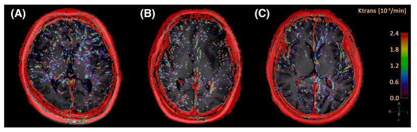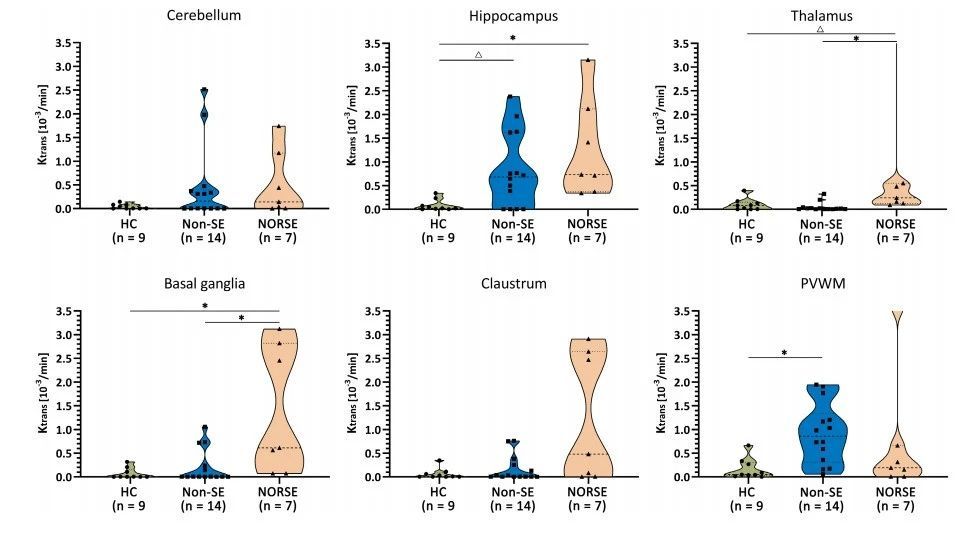 (一)由医院神经重症科与影像科合作发表题为Blood–brain barrier damage and new onset refractory status epilepticus: An exploratory study using dynamic contrast-enhanced magnetic resonance imaging:首次探索癫痫持续状态患者不同脑区血脑屏障受损情况的临床研究论文(第一作者:李惠平,主治医师,神经重症科;通讯作者:袁方,主治医师,神经重症科)。该研究共纳入7例新发难治性癫痫持续状态(NORSE)患者,14例无SE的脑炎患者以及9例健康对照者,运用动态对比增强核磁共振(DCE-MRI)技术分析了6个脑区(双侧海马、基底神经节、丘脑、屏状核、脑室周围白质和小脑)的血脑屏障通透性。结果显示NORSE患者的血脑屏障弥漫性受损,且其基底节和丘脑的血脑屏障受损程度显著高于无SE的脑炎患者。提示基底节和丘脑区血脑屏障的受损在NORSE的病理发展中起着重要作用。研究首次探索了SE患者不同脑区血脑屏障受损情况,为理解NORSE的病理机制、寻找NORSE治疗新靶点提供了理论依据。