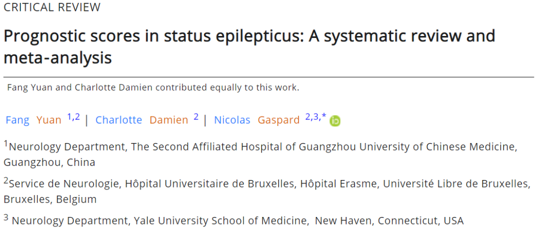 (二)由广东省中医院神经重症科与比利时Erasme医院合作发表题为Prognostic scores in status epilepticus: A systematic review and meta‐analysis:为未来制定效能更好临床评分提供理论依据的临床综述研究(第一作者:袁方博士,广东省中医院;通讯作者:Nicolas Gaspard教授,比利时Erasme医院兼耶鲁大学博士研究生导师)。该研究首次对癫痫持续状态临床评分进行了系统回顾和荟萃分析,纳入21项相关研究共2437名癫痫持续状态患者,对4个常用评分的效能进行评估及比较。结果发现目前发表的SE评分的临床效能(AUC、敏感性、特异性等)均欠理想。其中EMSE-EAC评分的总体效能较低,STESS-3的敏感性最高,STESS-4的特异性最高。所有这些评分的阴性预测值都很高,而阳性预测值较低。提示在临床实践中,这些评分均需谨慎使用,未来有必要研究制定效能更好的癫痫持续状态临床评分。