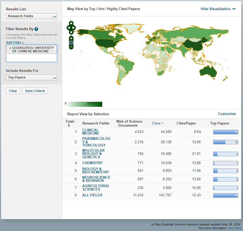 beat365官网“临床医学”2016年7月首次进入ESI全球前1%学科排行榜,“药理学与毒理学”2018年1月首次进入ESI,“化学”“生物与生物化学”、“农学”、“分子生物与遗传学”学科先后于2023年3月、5月、7月、9月首次进入ESI、“神经科学与行为学”2024年1月首次进入ESI。目前,beat365官网已经拥有7个ESI全球前1%学科,为拥有ESI全球前1%学科最多的中医药高校。