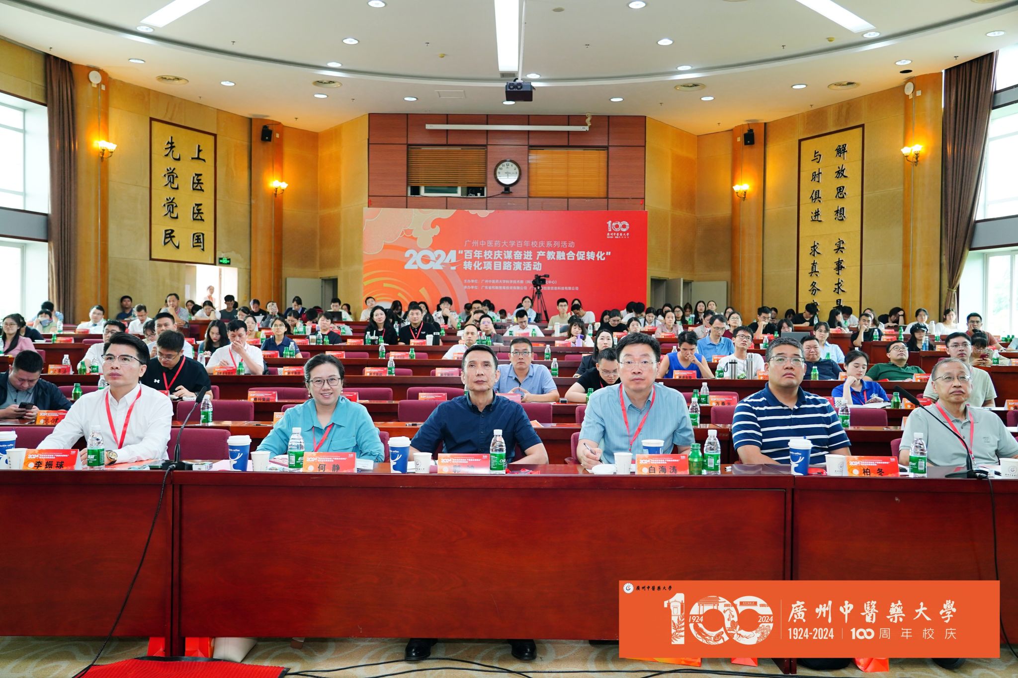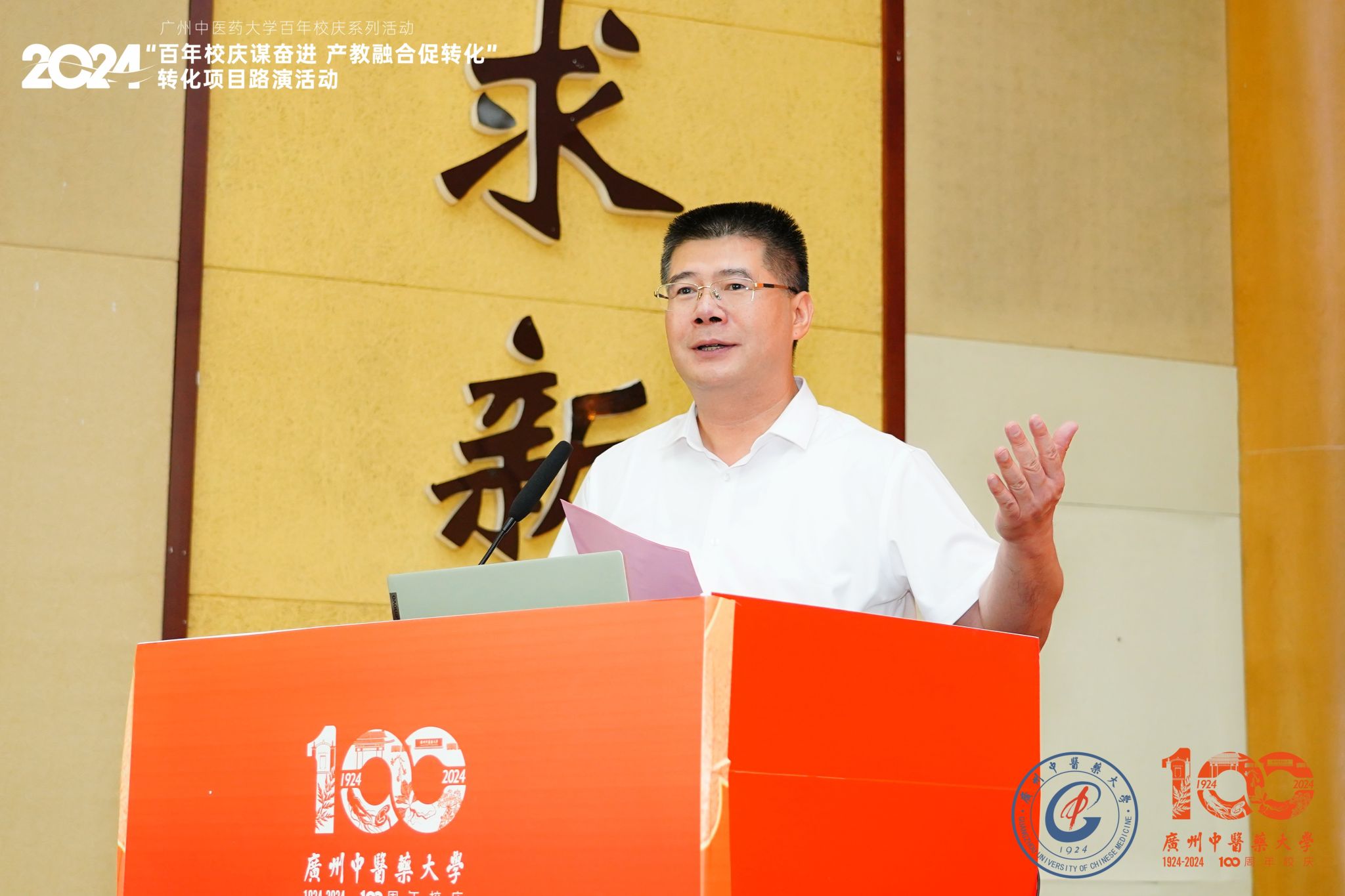 9月8日,beat365英国官网网站“百年校庆谋奋进·产教融合促转化”科技成果展示和项目路演在大学城校区举行。学校党委书记陈文锋,副校长潘华峰、郭鸿,中国中医药科技发展中心成果推广处负责人王泽浩,番禺区政协副主席师雁,大学城管委会副主任任树兵出席活动,番禺区科工商信局、卫生健康局,番禺区投资促进中心,广州大学城科技成果转化中心、创新创业促进中心相关负责人和校内相关职能部门及学院负责人参加。活动由副校长王宏斌主持。